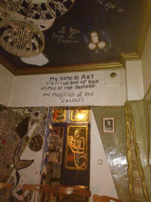 Iltakävelyllä pistäydyimme houkuttelevan näköiseen baariin, ja pääsimme kuokkimaan avajaisbileisiin. Hiukan epäselväksi jäi, oliko kyse baarin vai näyttelyn avajaisista. Komeeta oli kuitenkin!